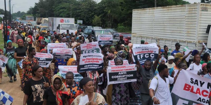 A coalition of civil society groups under the banner of the National Interest Coalition staged a large protest in Abuja on Monday against what they described as a “grand plot” by senior public officials to derail President Bola Tinubu’s anti-corruption agenda and weaken the Economic and Financial Crimes Commission (EFCC).